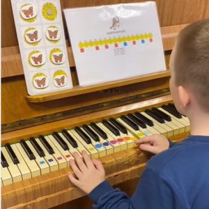 Саша разбирает произведение; исполнение композиции наизусть. Будущему музыканту всего 6 лет. Игра по цветным ноткам это его хобби и основная корреляционная возможность для вмешательства.